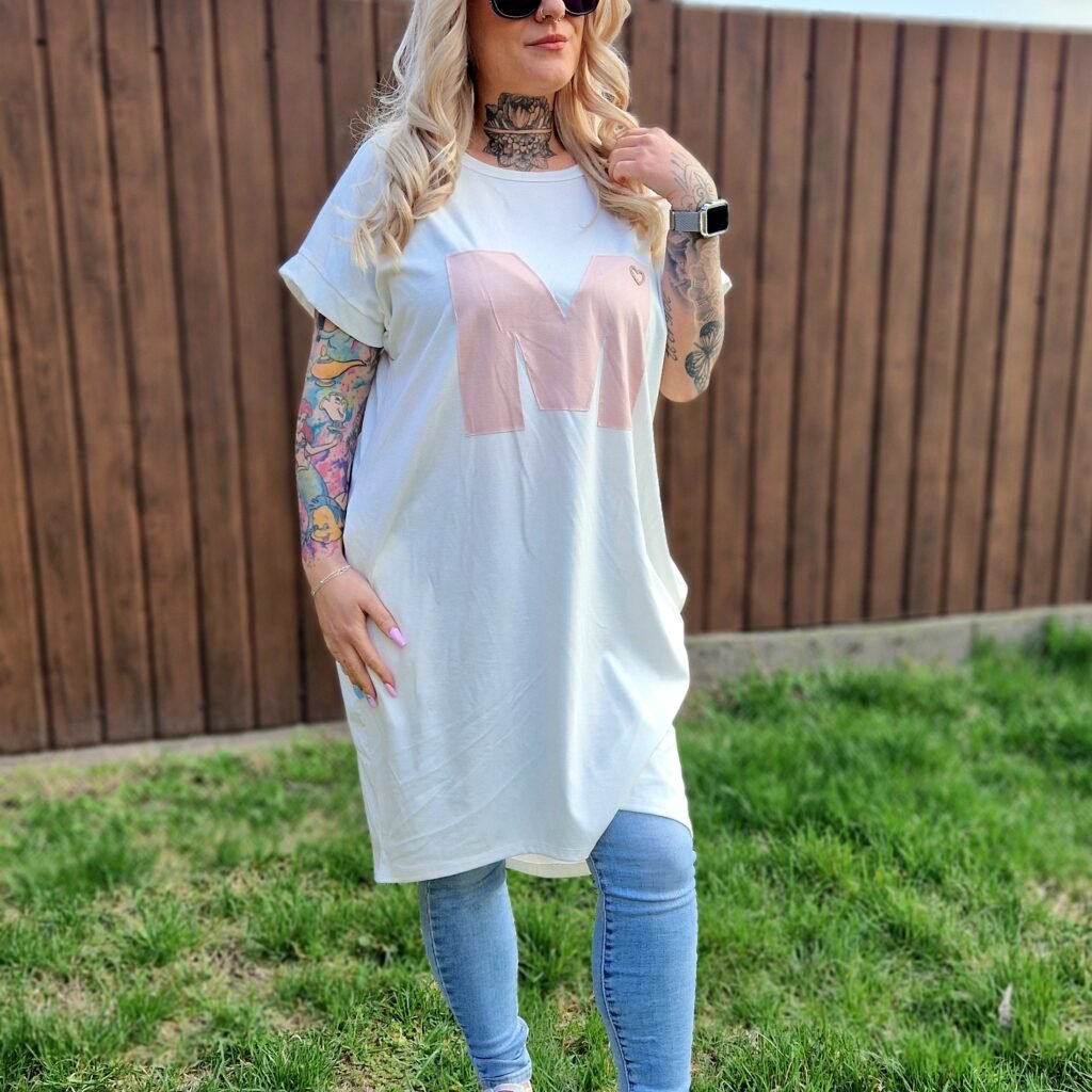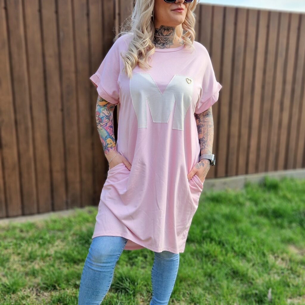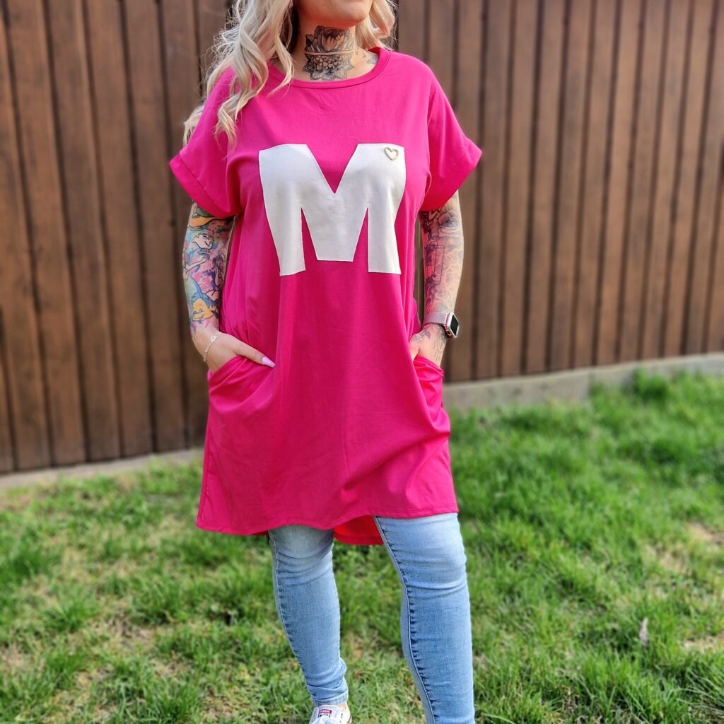 A Marina pink–fehér tunika vidám és nőies darab, ami tökéletes választás a hétköznapi szettekhez. A pink alapon a fehér “M” betű játékos, figyelemfelkeltő részlet az elején, miközben a praktikus zsebek extra kényelmet biztosítanak.
