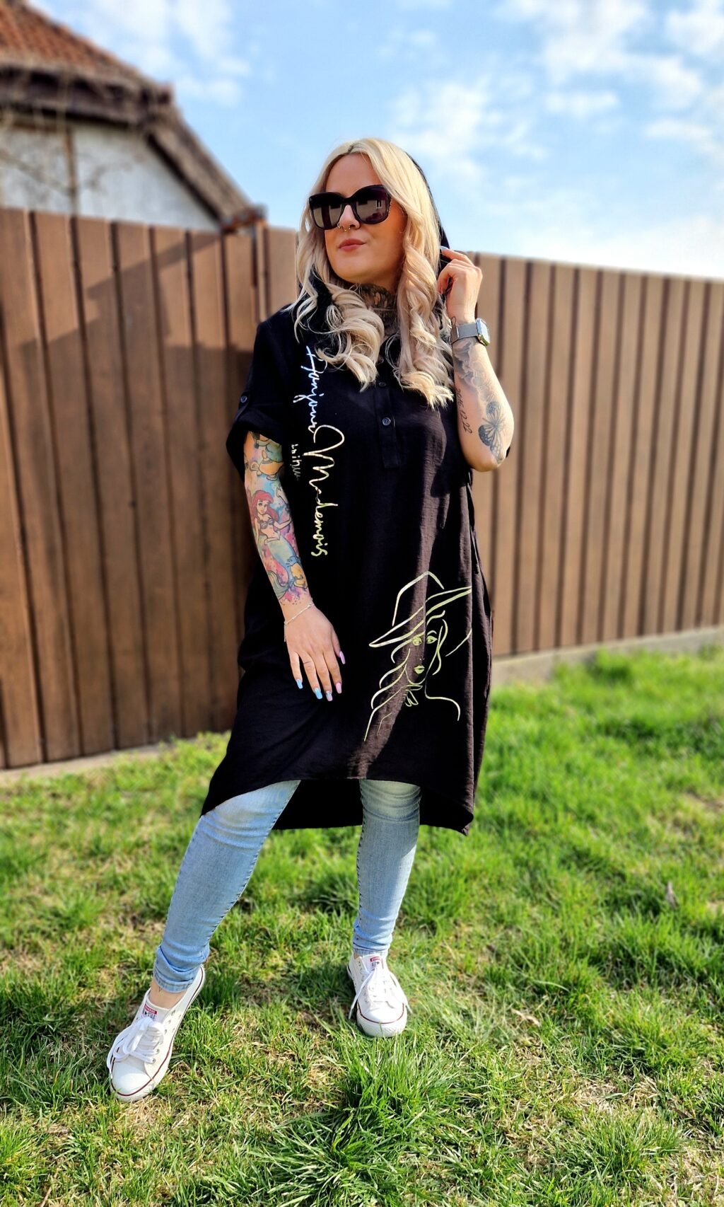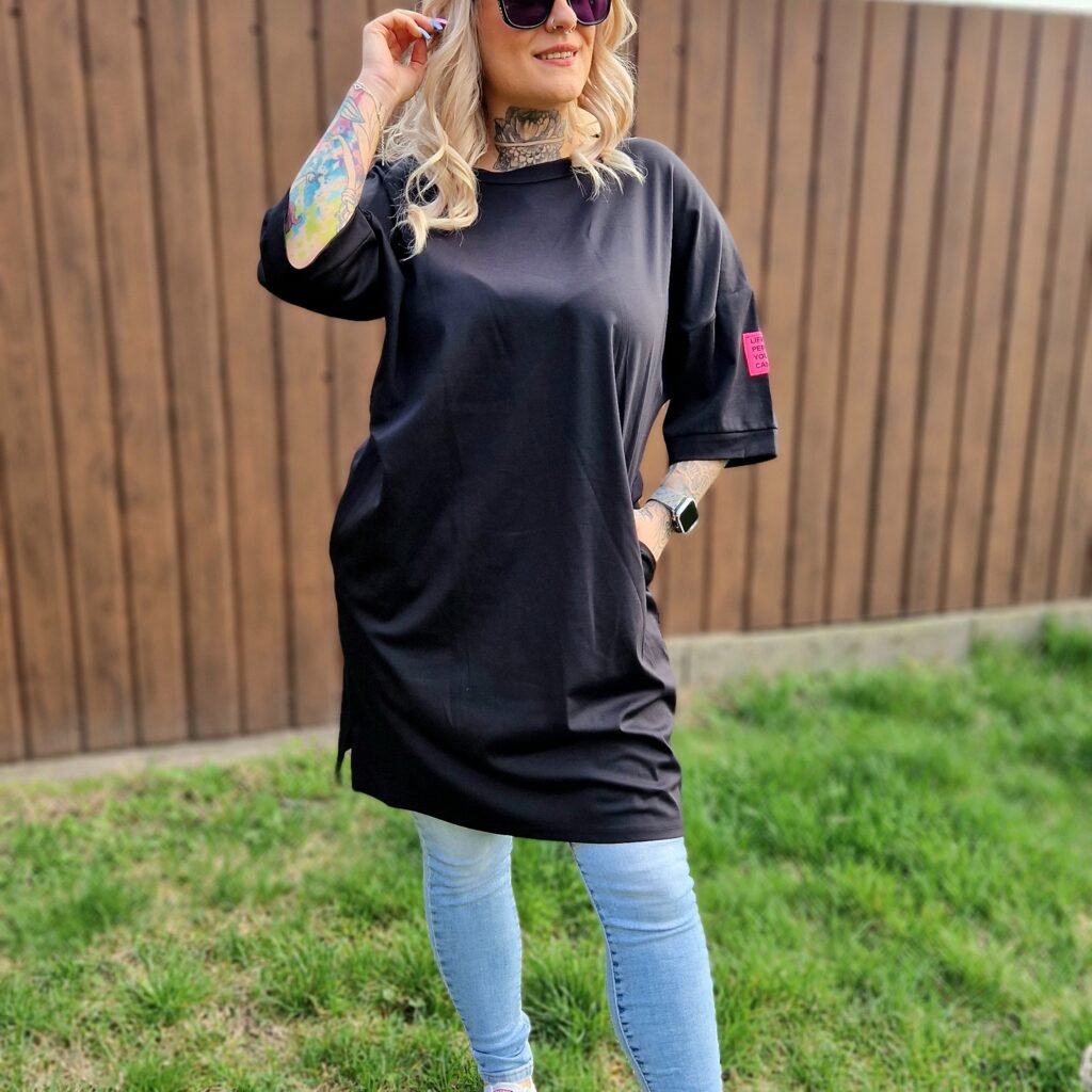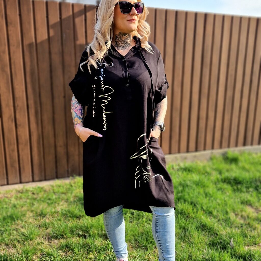 A Selina bő, kapucnis tunika kényelmes és stílusos darab, amely tökéletes választás a laza, hétköznapi szettekhez. A fekete alapot arany színű írás és női alak motívum teszi különlegessé és figyelemfelkeltővé.