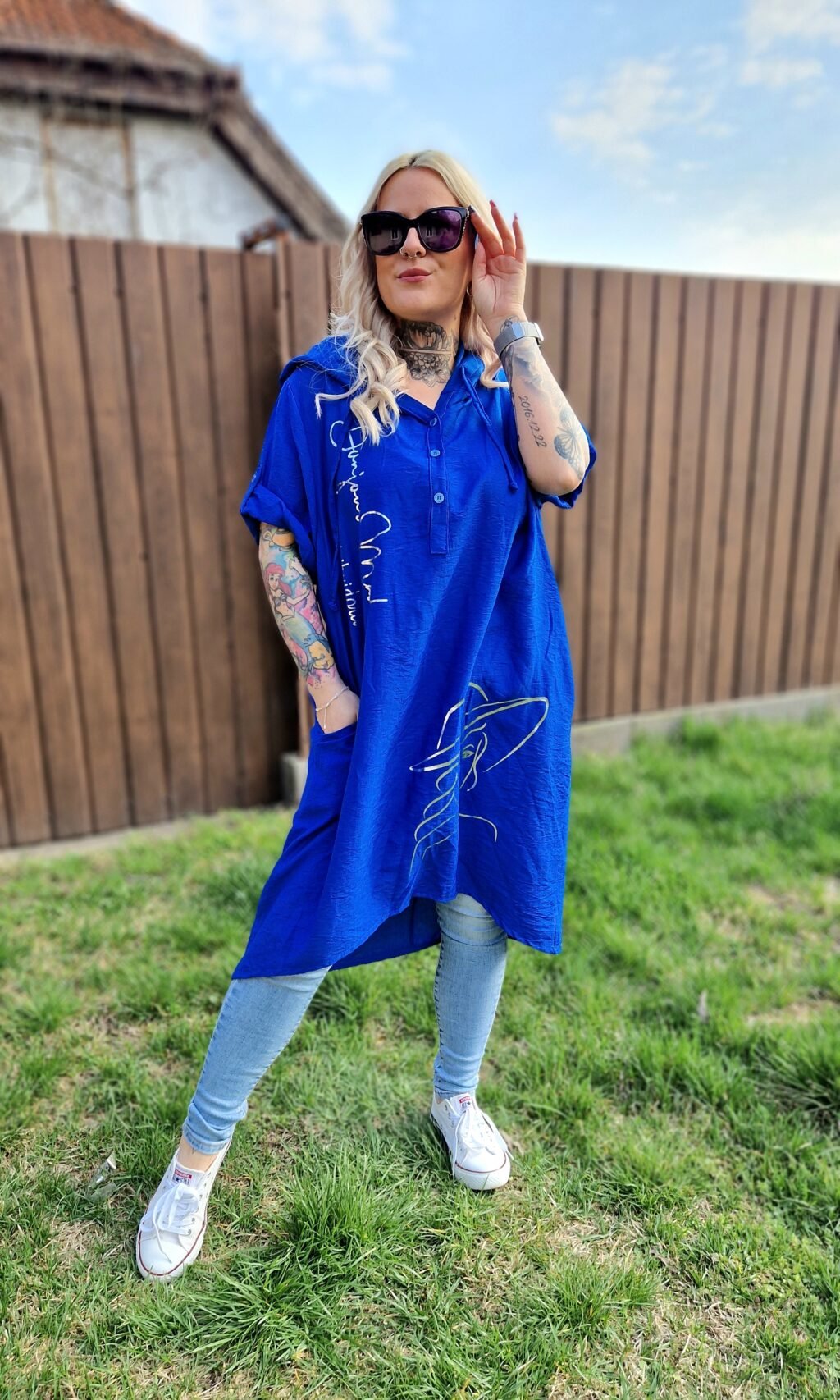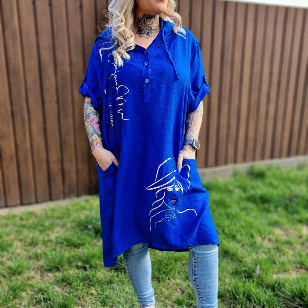 A Selina bő, kapucnis tunika királykék változata kényelmes és stílusos darab, amely tökéletes a laza, hétköznapi szettekhez. A mély királykék alapot arany színű írás és női alak motívum díszíti, így igazán figyelemfelkeltő és elegáns hatást kelt.