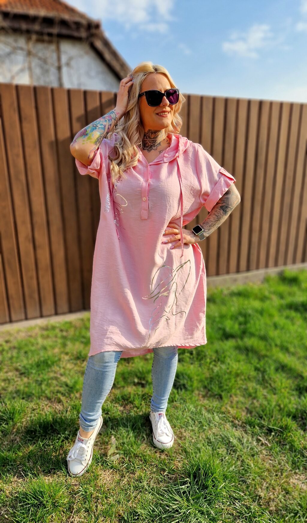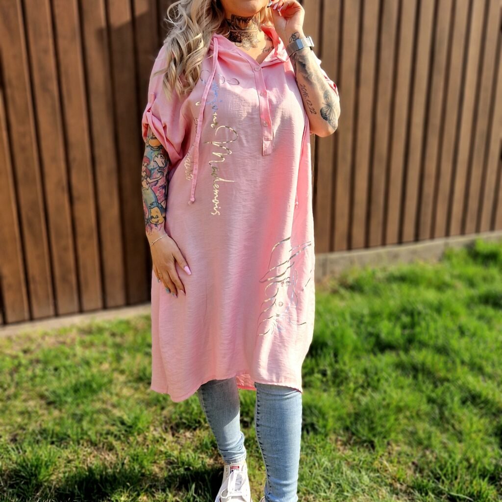 A Selina bő, kapucnis tunika rózsaszín változata vidám és nőies darab, ami tökéletes a laza, hétköznapi szettekhez. A rózsaszín alapot arany színű írás és női alak motívum díszíti, így igazán figyelemfelkeltő és stílusos hatást kelt.