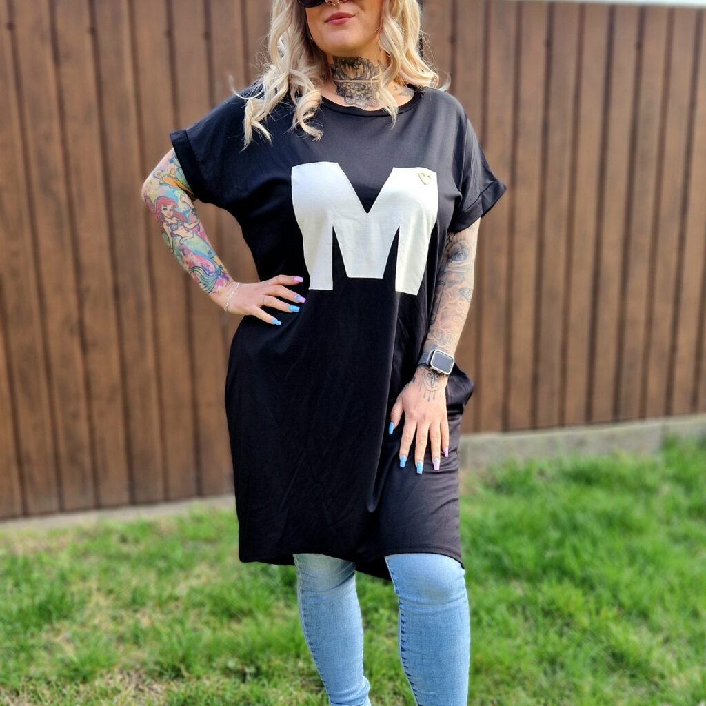 A Marina fekete–fehér tunika elegáns és játékos darab egyszerre. A fekete alapot a fehér “M” betű teszi különlegessé az elején, miközben a praktikus zsebek kényelmes és funkcionális kiegészítést adnak a mindennapokhoz.