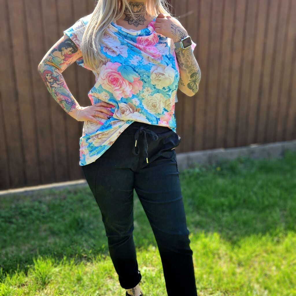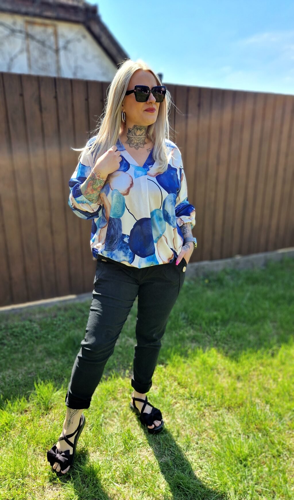 A Livi felső most gyönyörű kék virágmintás változatban is elérhető, ami friss, elegáns és nőies megjelenést ad. A V-nyak finoman kiemeli a dekoltázst, a gumis derékrész pedig kényelmes illeszkedést biztosít, miközben szépen formálja az alakot.