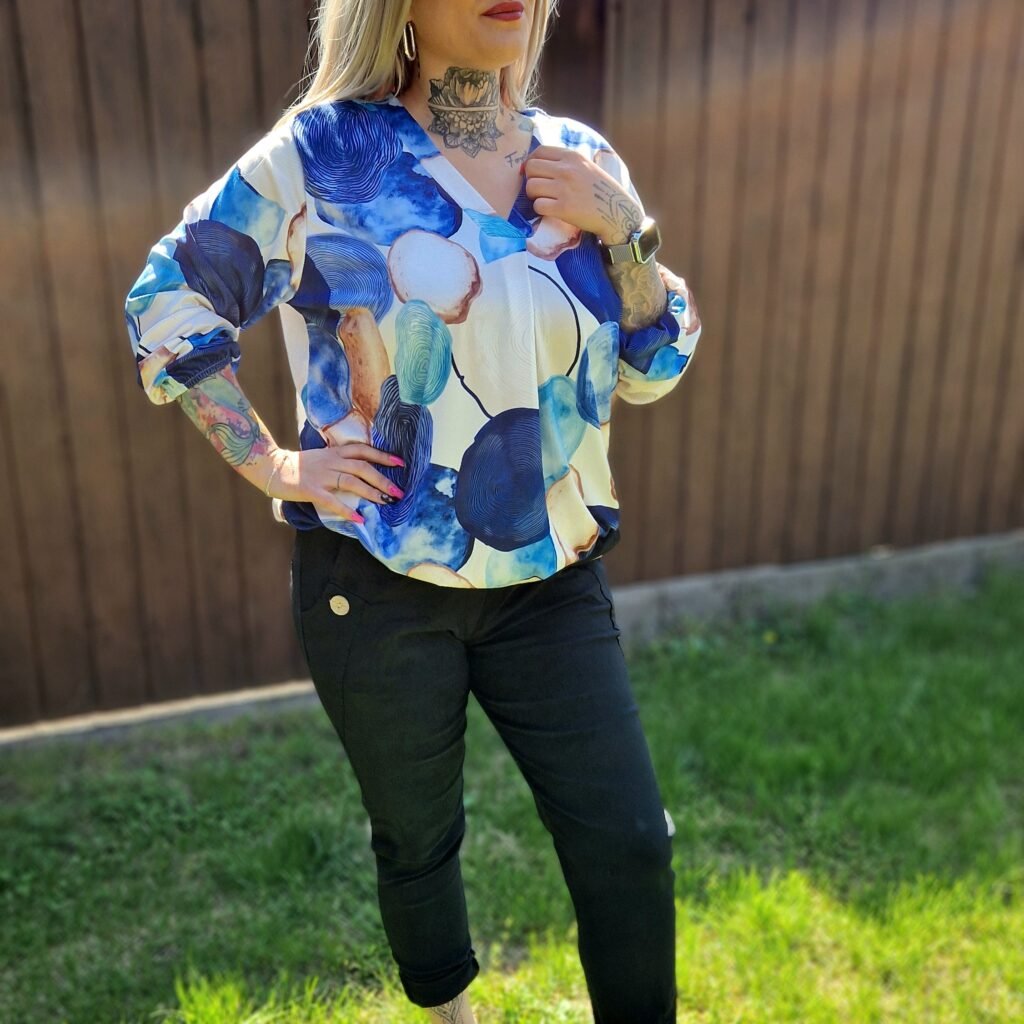 A Vanda felső egy igazán nőies, friss darab kék mintával, ami könnyed és elegáns megjelenést ad. A V-nyak szépen kiemeli a dekoltázst, a gumis derékrész pedig kényelmesen illeszkedik és finoman hangsúlyozza az alakot.