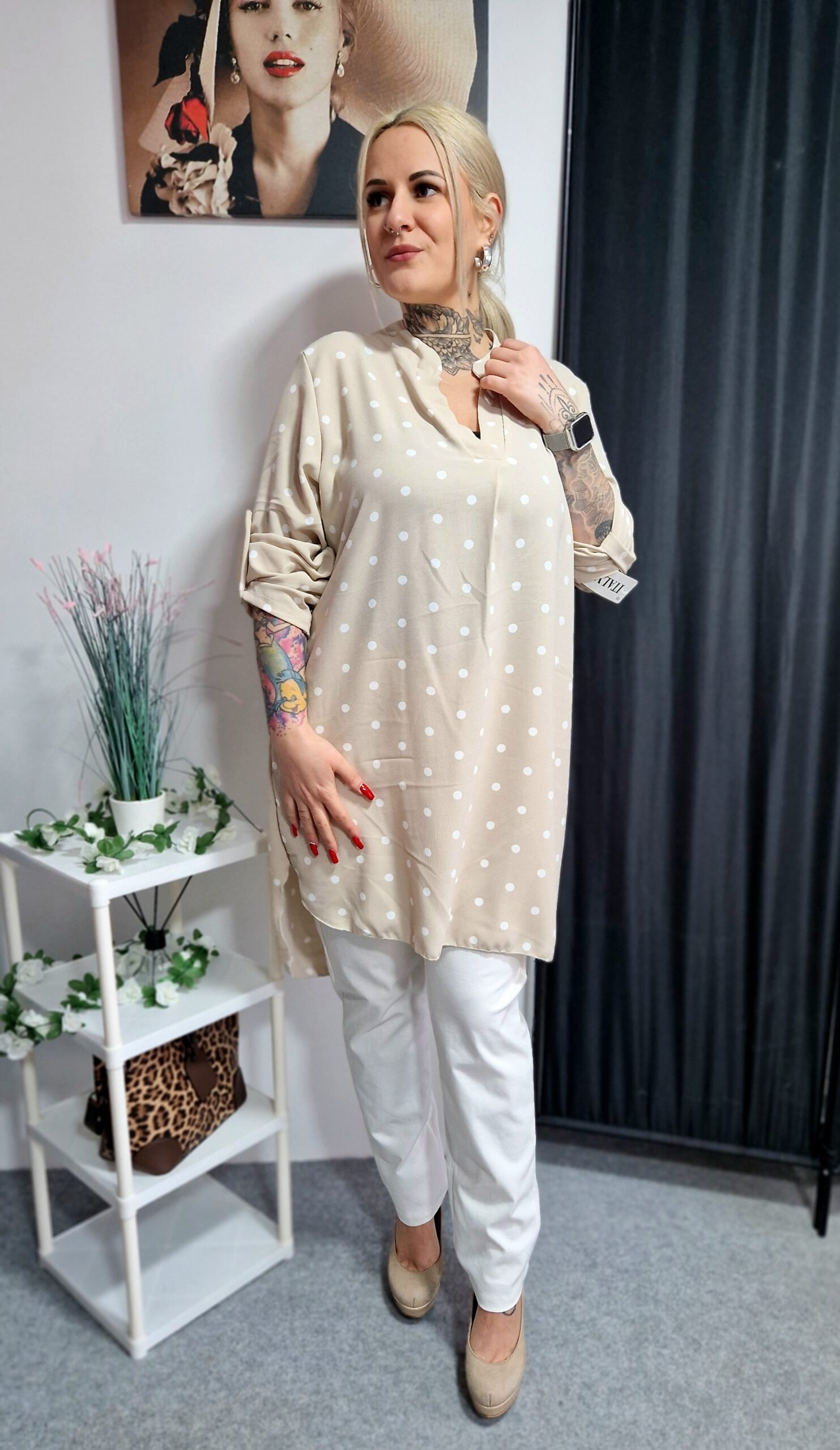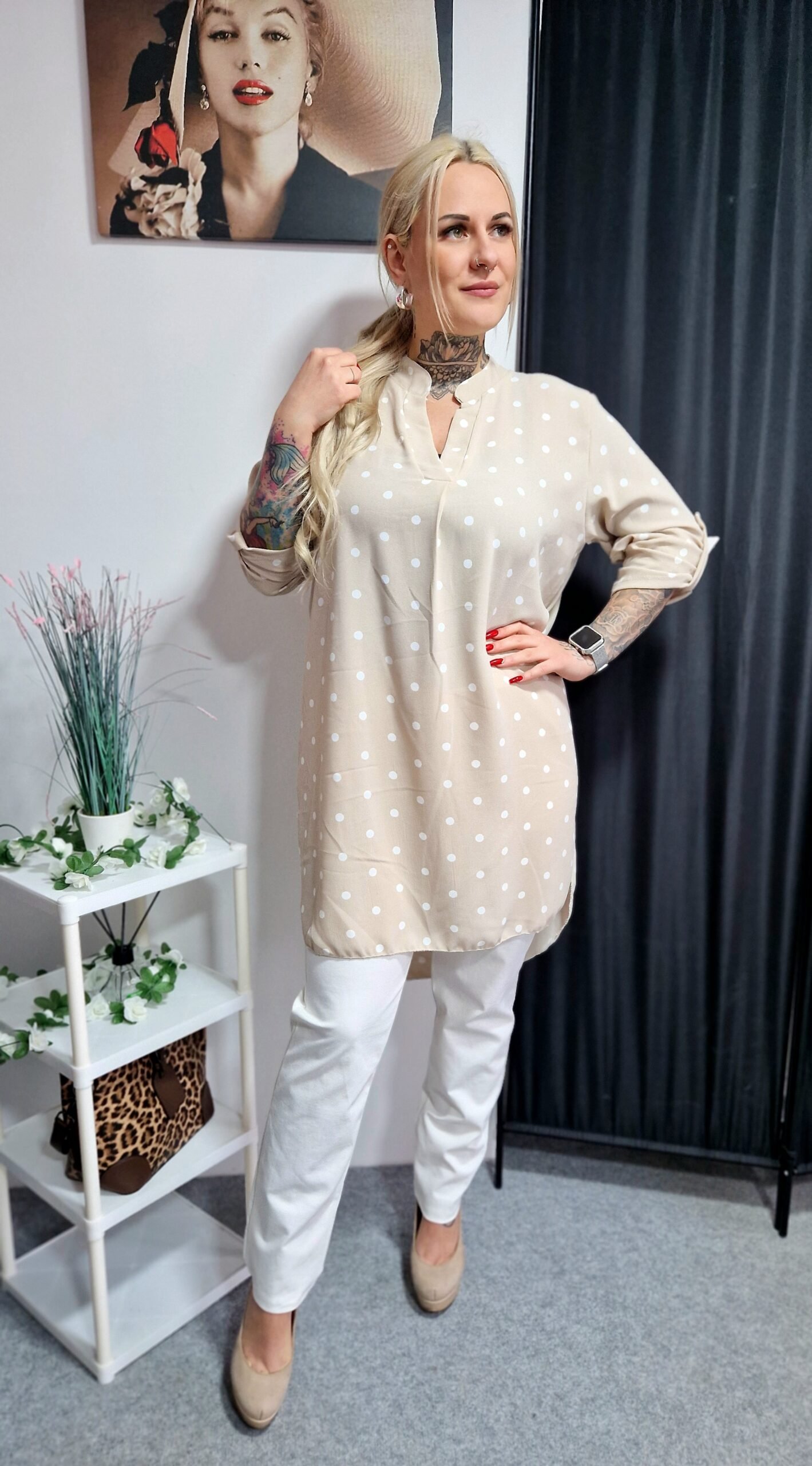 Viseld fehér vagy fekete nadrággal, leggingsel a hétköznapokra, alkalmi stílusban szoknyával. Világos vagy barna táskával, valamint arany ékszerekkel igazán harmonikus és nőies hatást érhetsz el.