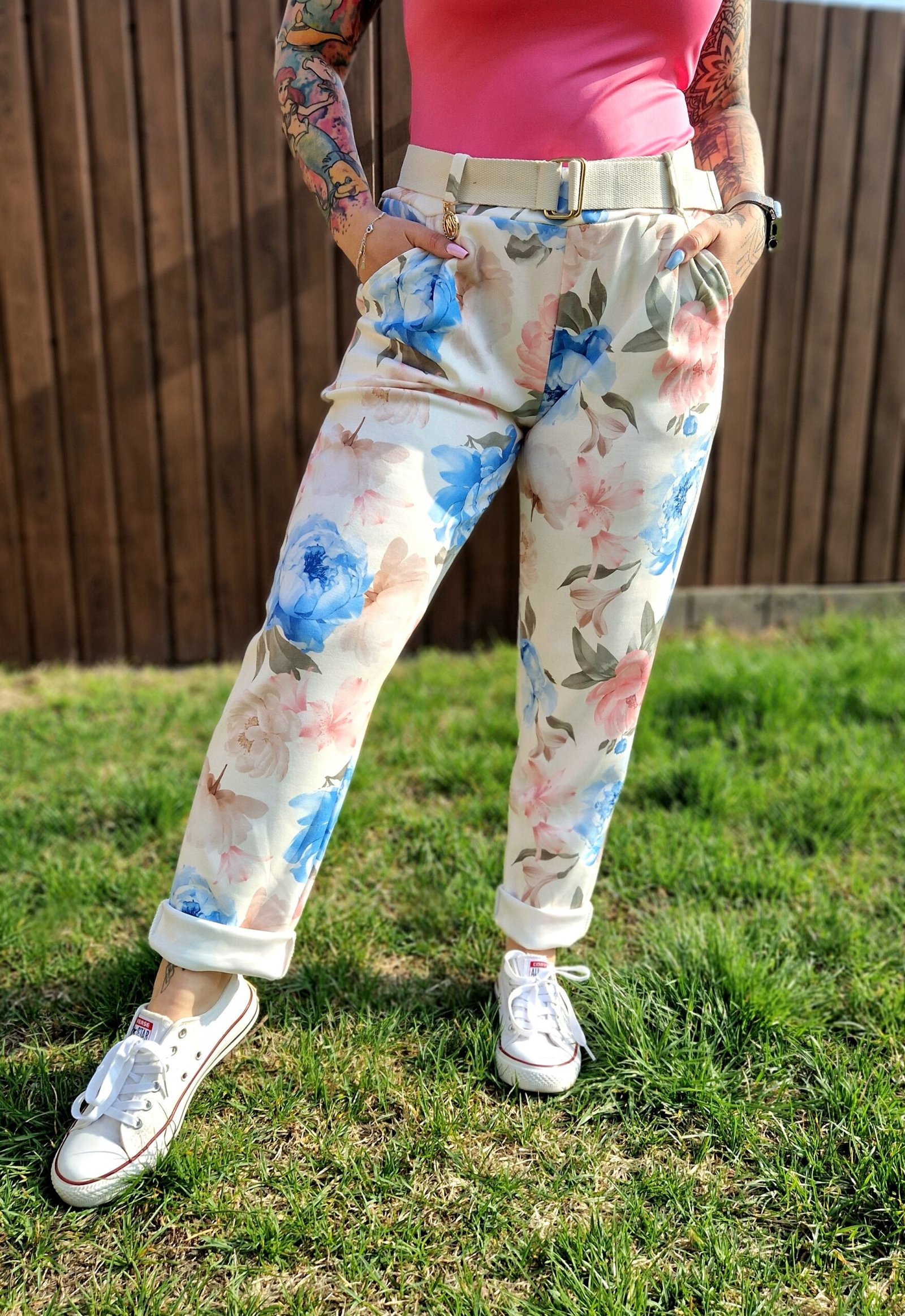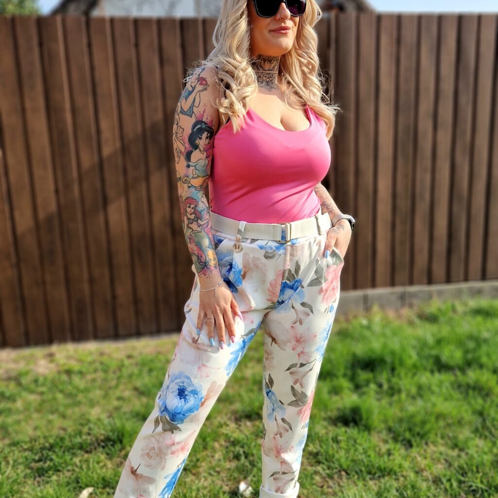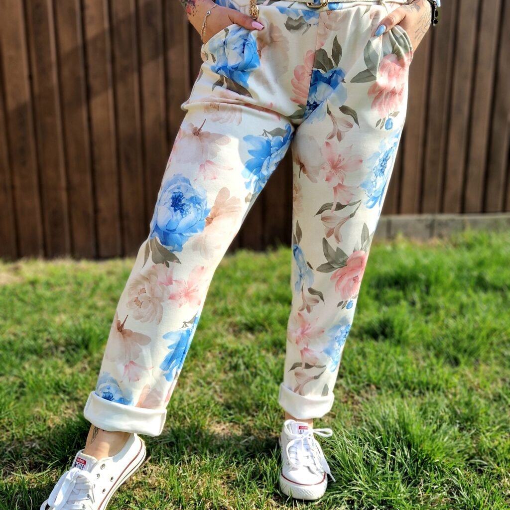 A Flóra virágmintás nadrág igazán friss és nőies darab, ami tökéletes választás a tavaszi–nyári időszakra. A bézs alapon kék és rózsaszín virágminta romantikus és vidám hangulatot ad, miközben könnyen kombinálható más darabokkal is.