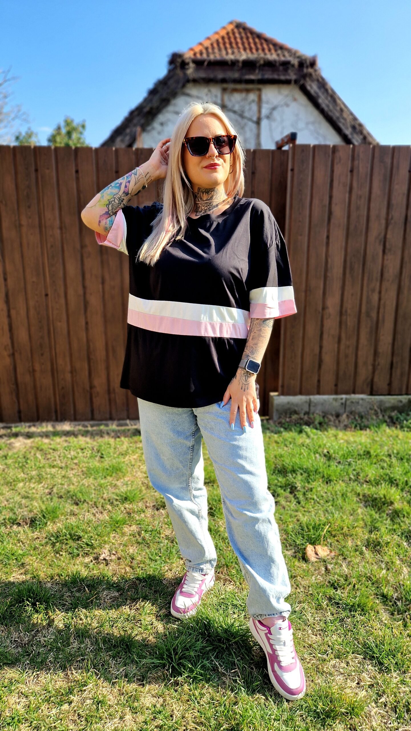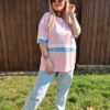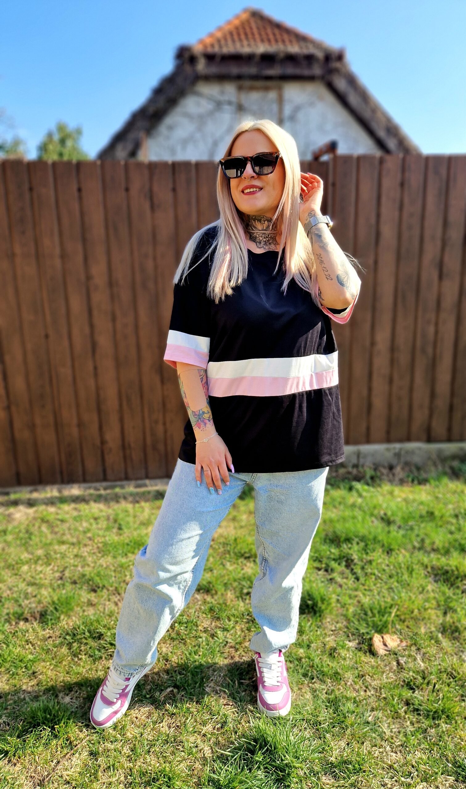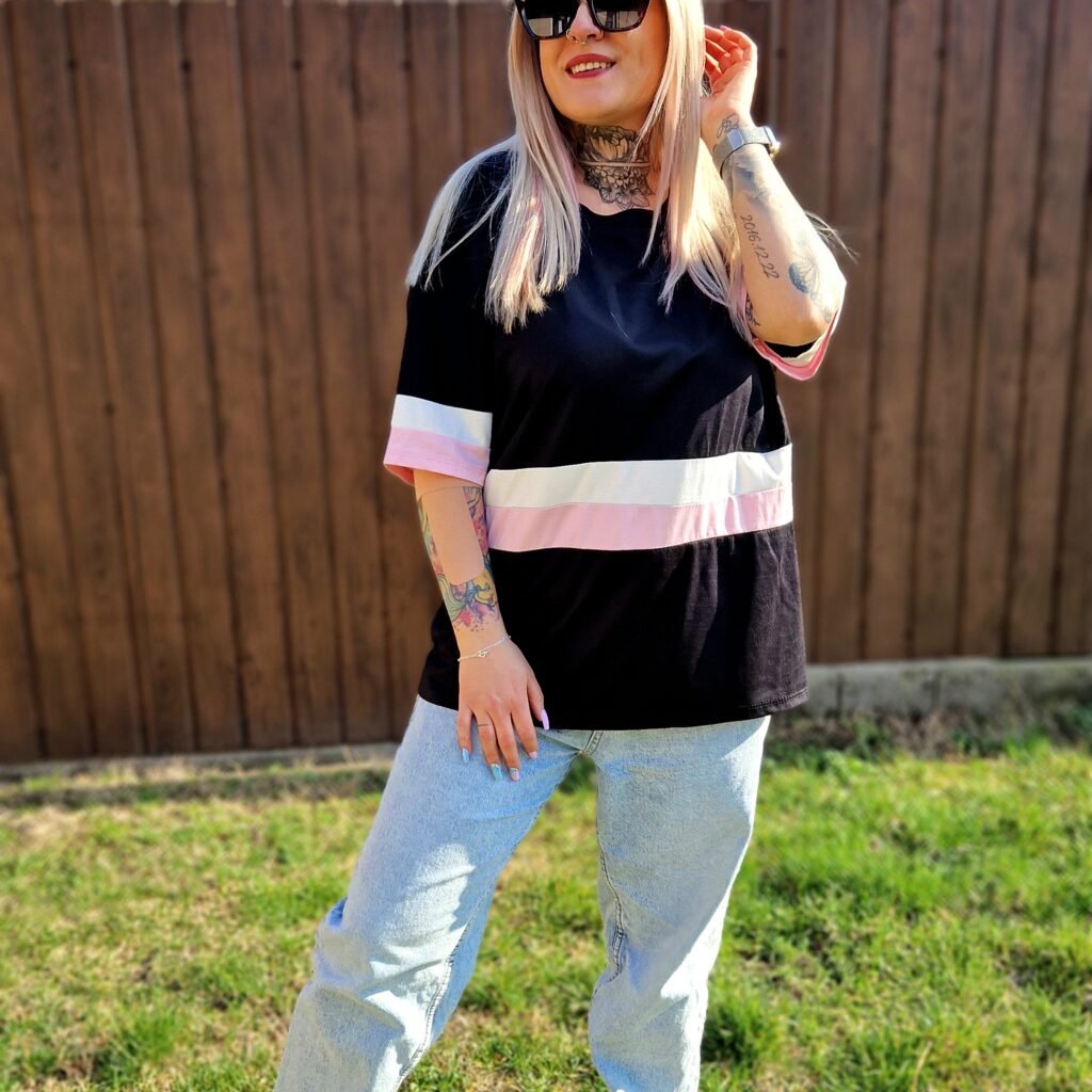 A Lara fekete csíkos pamut póló egy stílusos és sokoldalú darab, amely feldobja a hétköznapi szetteket. A fekete alapszín közepén futó rózsaszín-fehér csík friss, játékos kontrasztot ad, miközben az egyszerű fazon kényelmes és könnyen kombinálható.