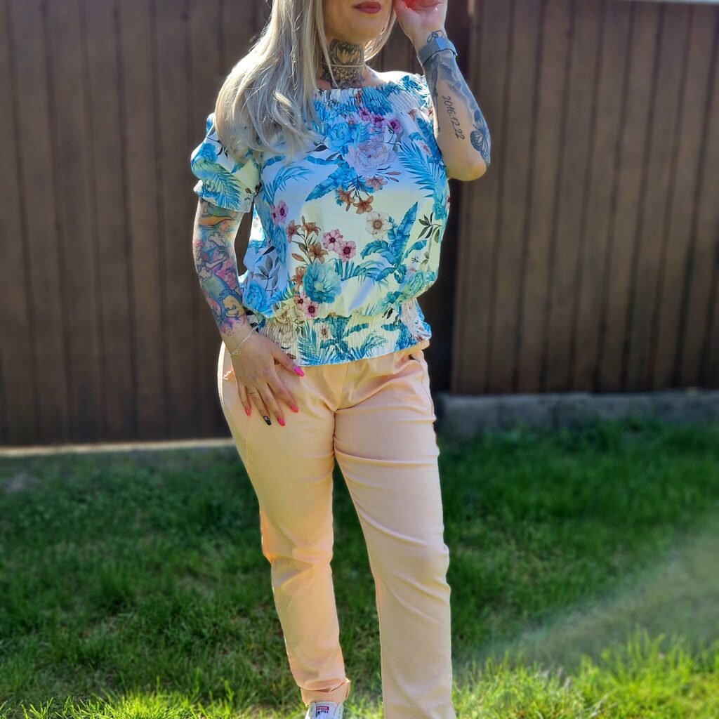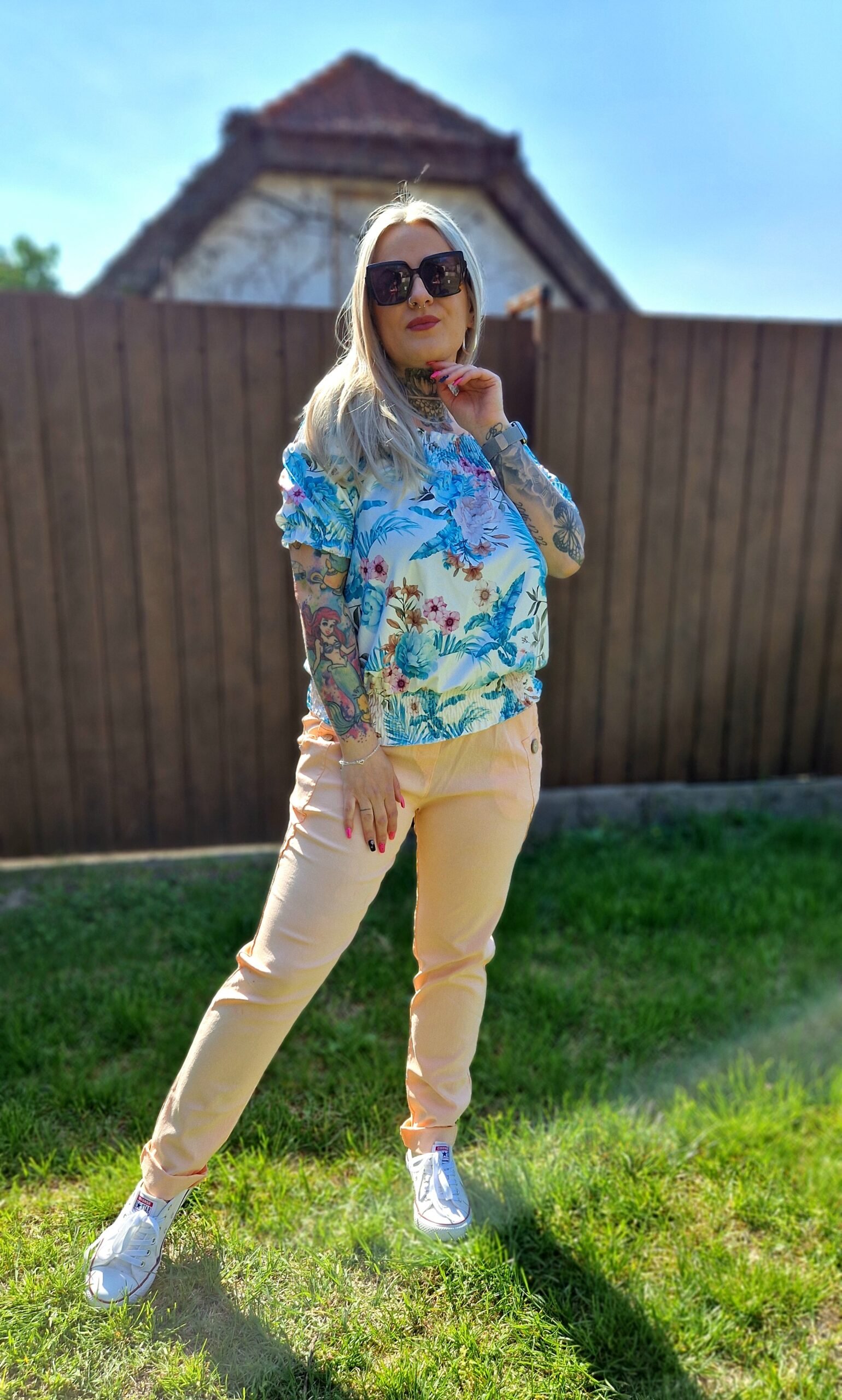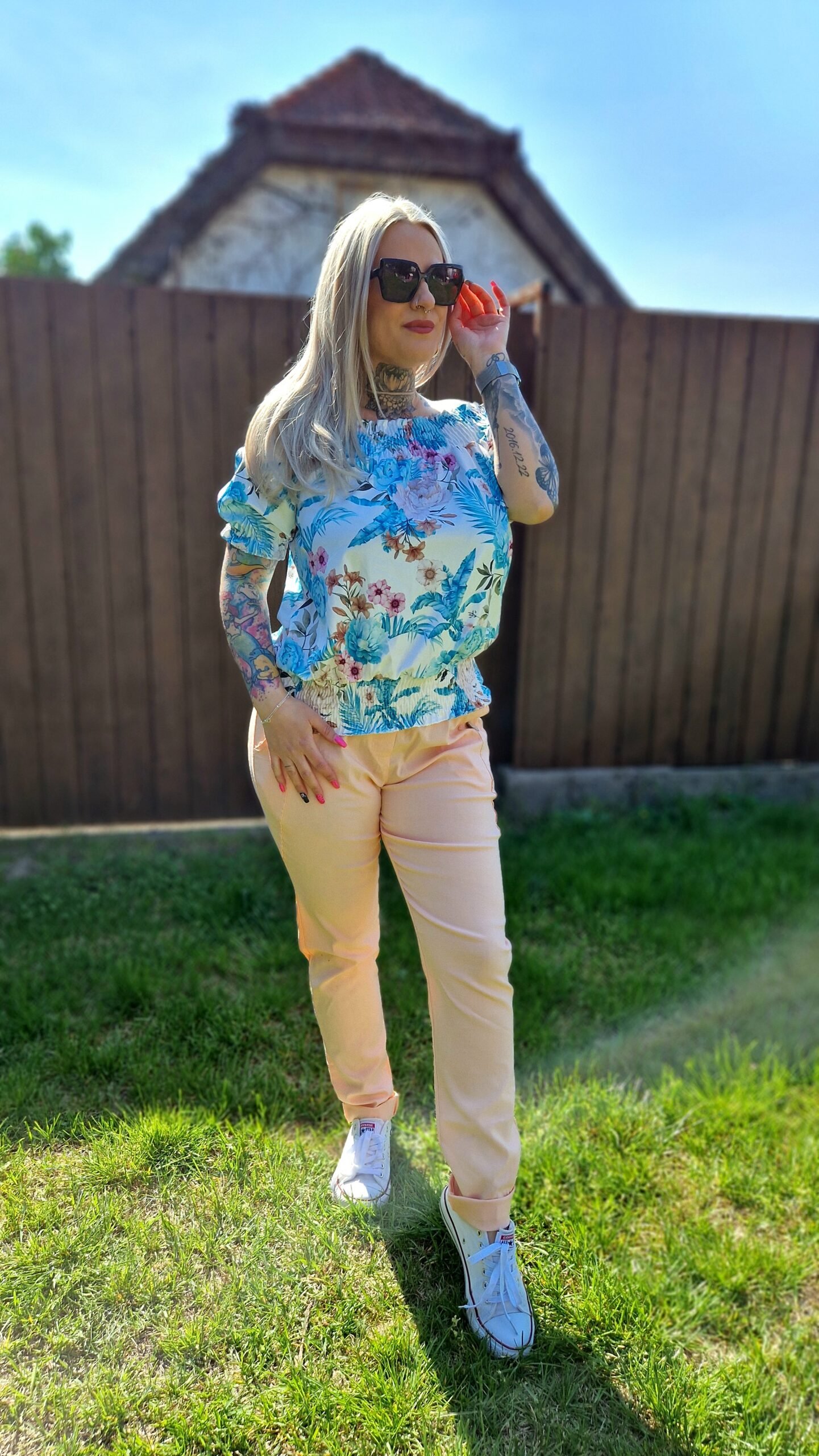 A népszerű Lilla felső most vidám, színes virágmintás változatban is elérhető! A fehér alapot élénk virág- és levélminták díszítik, ami igazán friss, nyári hangulatot ad a szettnek.