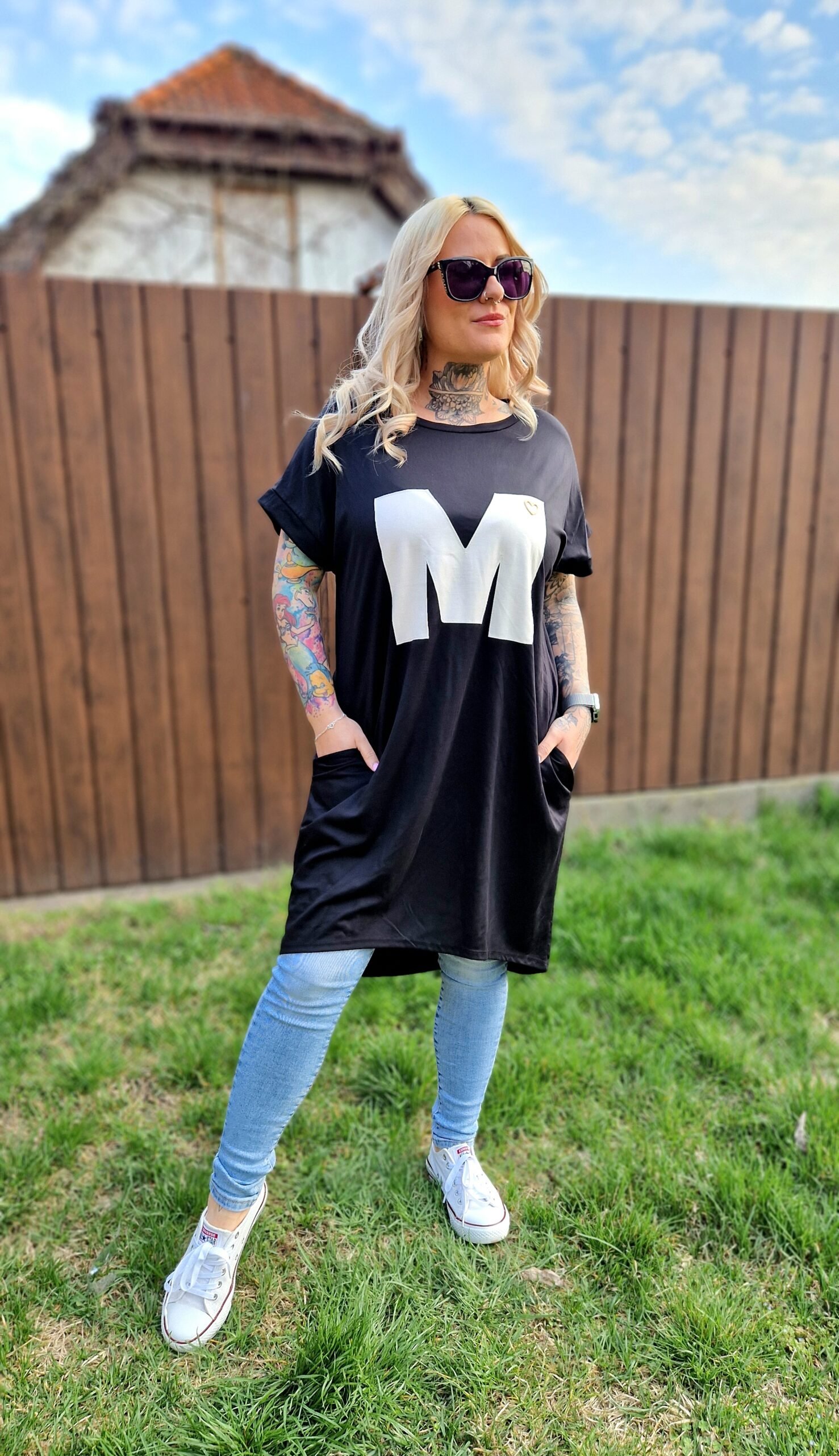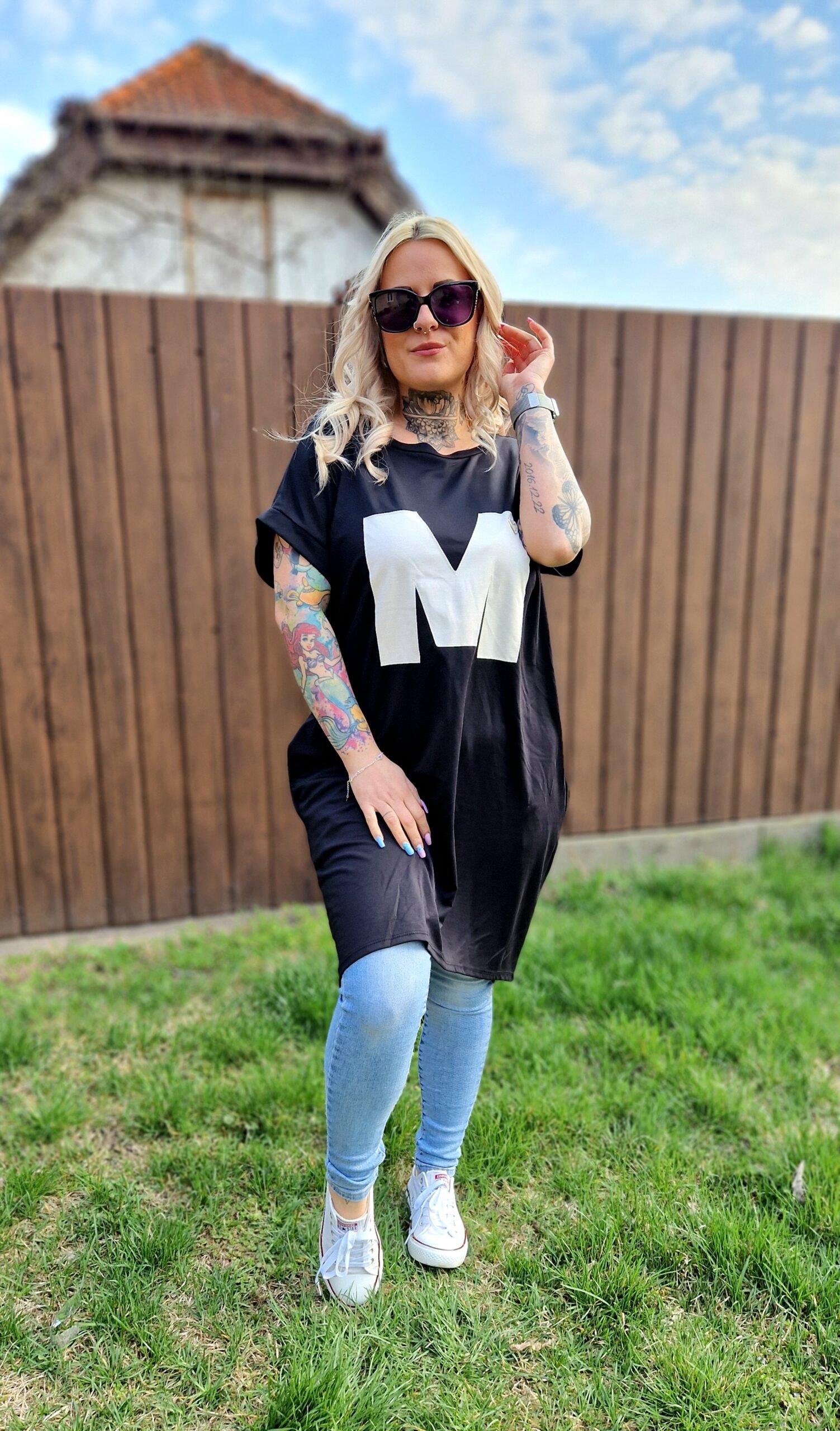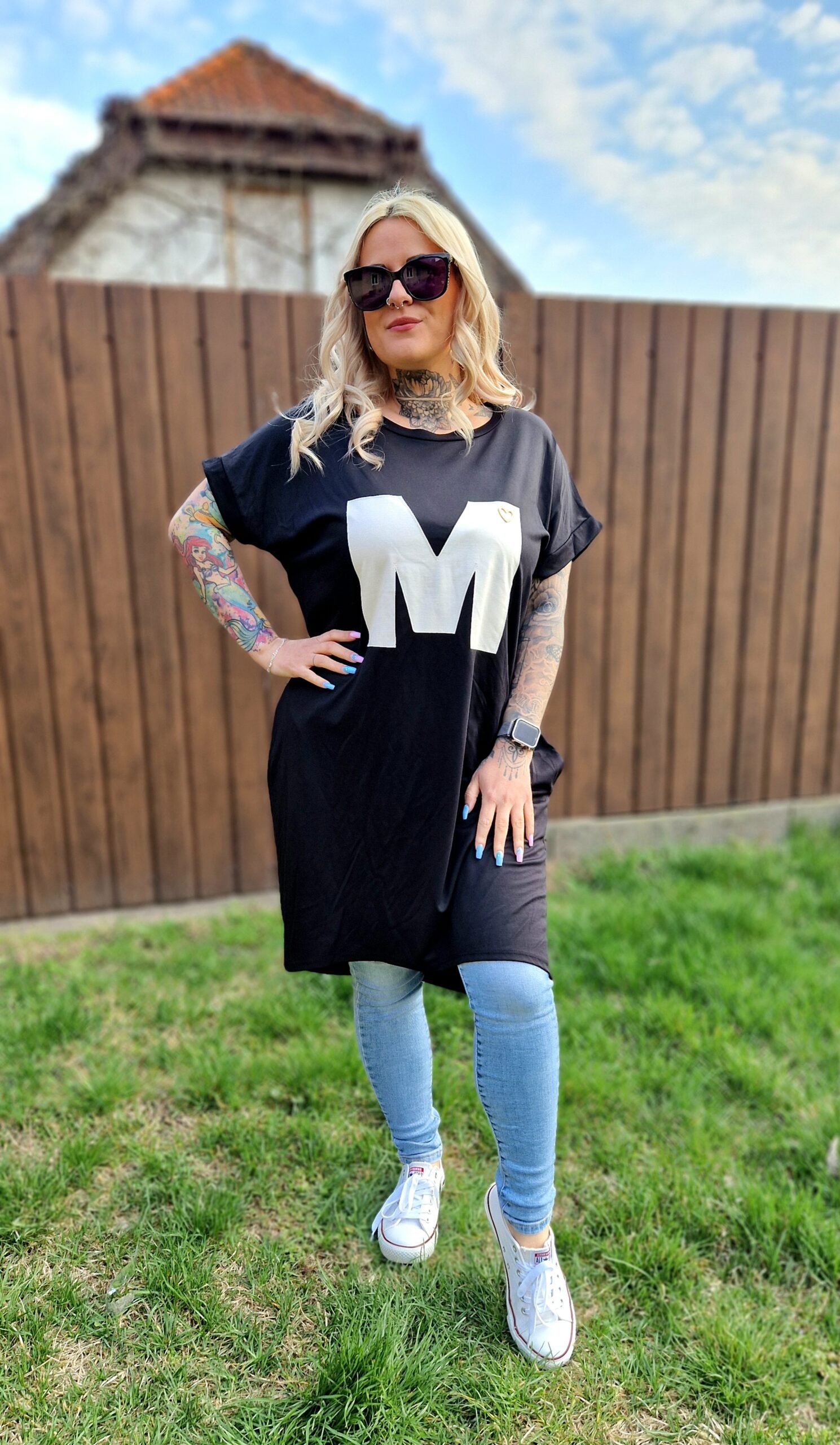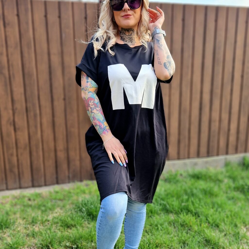 A Marina fekete–fehér tunika elegáns és játékos darab egyszerre. A fekete alapot a fehér “M” betű teszi különlegessé az elején, miközben a praktikus zsebek kényelmes és funkcionális kiegészítést adnak a mindennapokhoz.