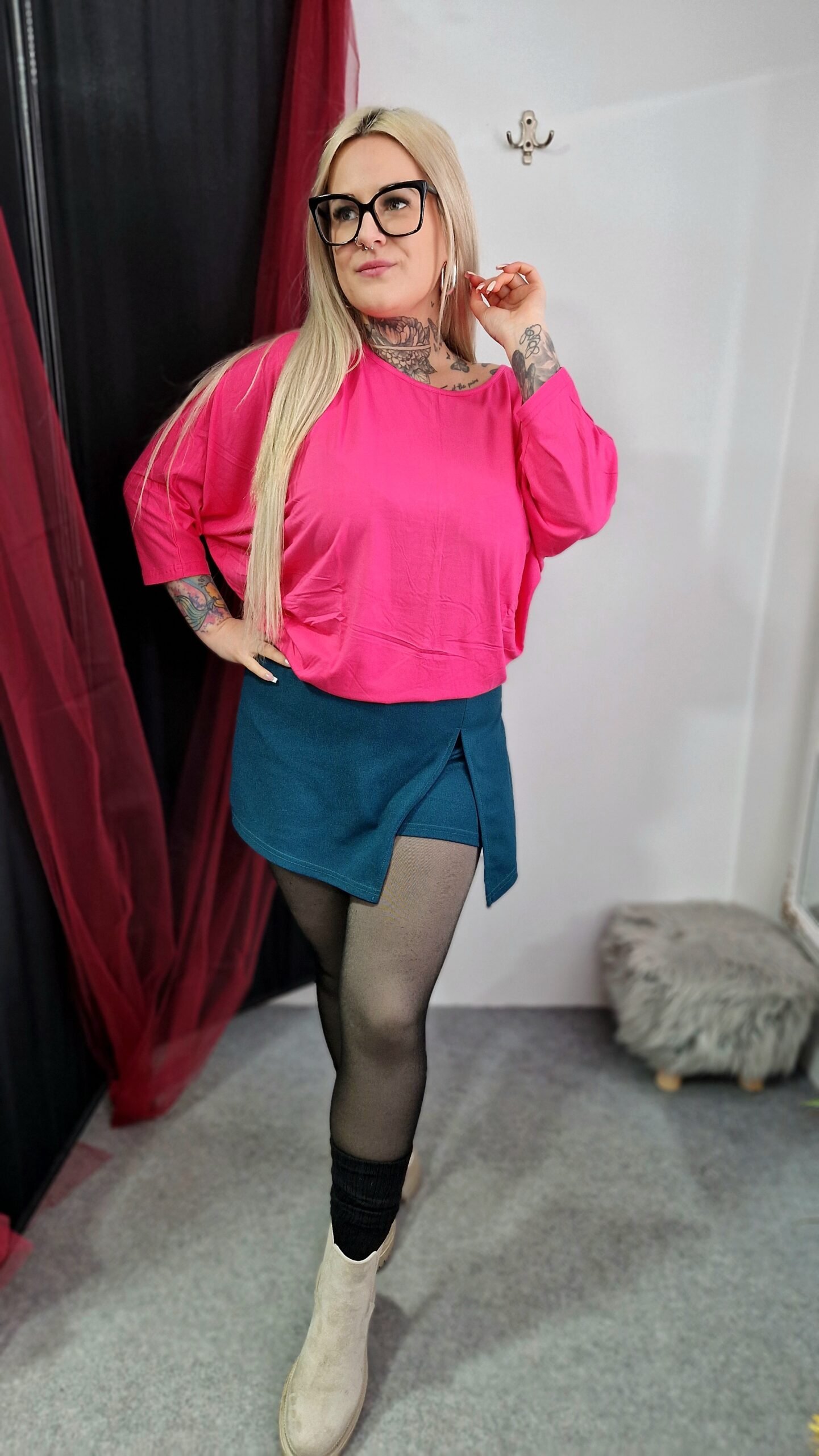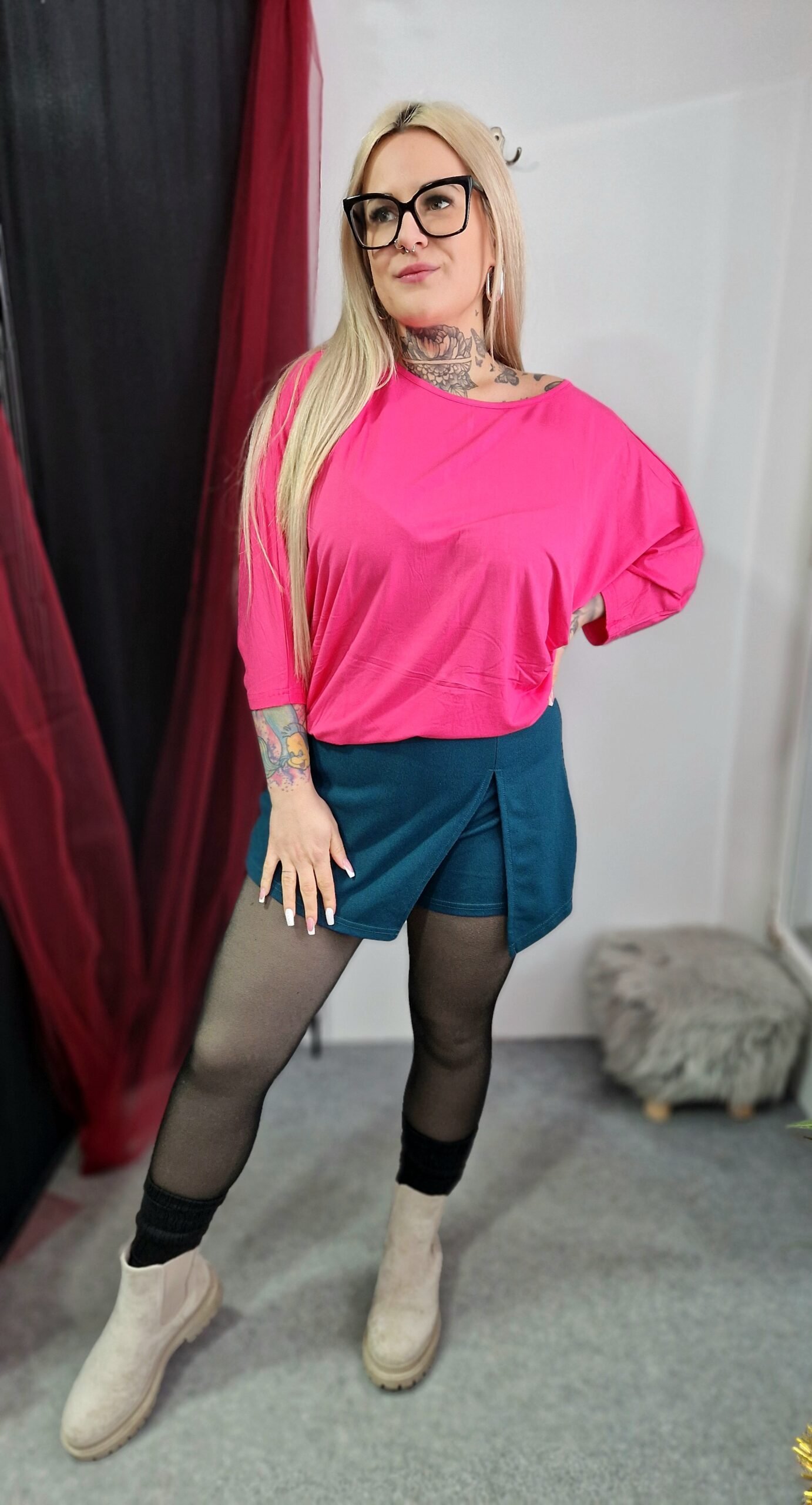 A Pink Aura denevérujjú pamut felső nőies és kényelmes választás minden napra. Laza szabása és denevérujjú fazonja lágy esést biztosít, miközben puha pamut anyaga egész napos komfortot nyújt. A rózsaszín árnyalat friss és üde, így tökéletes alapdarab, amit könnyedén kombinálhatsz különböző stílusokkal.