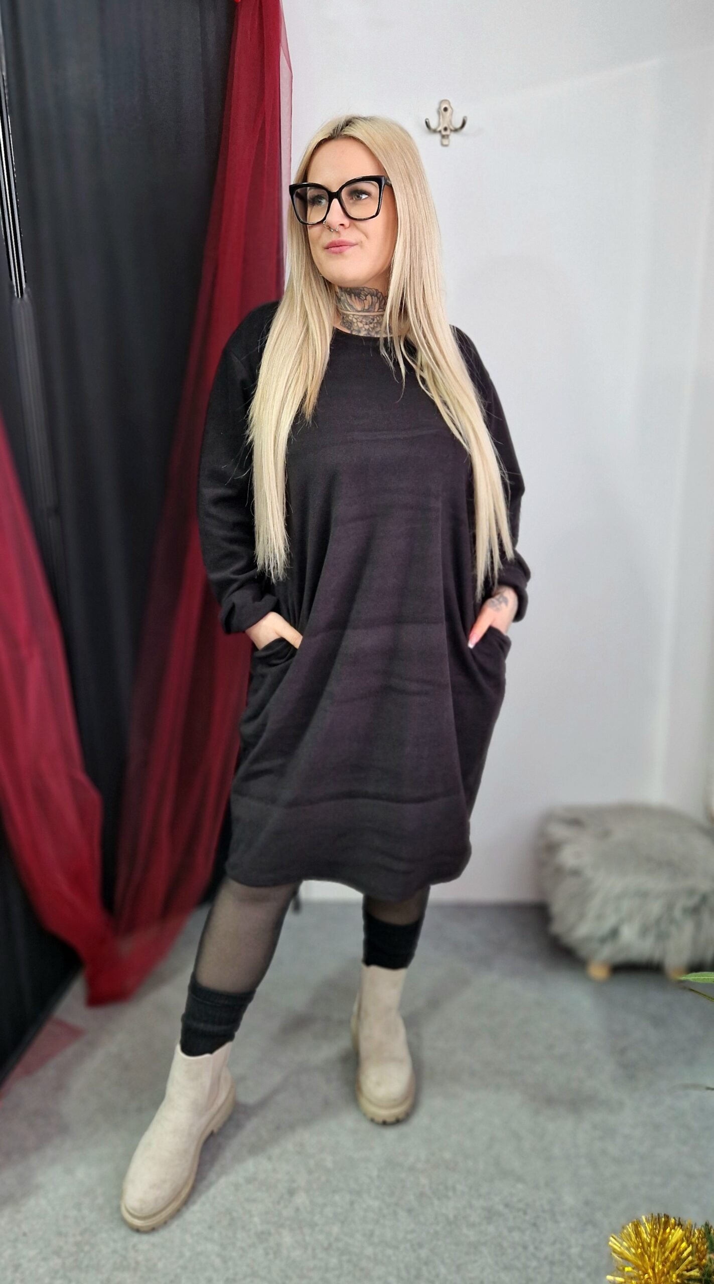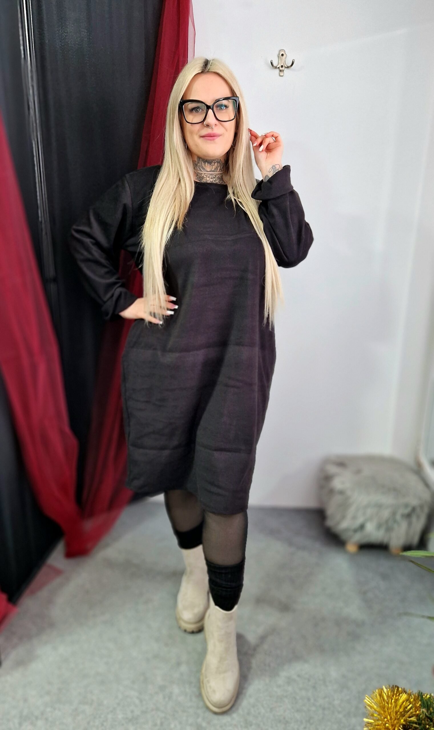 Kombináld bőrhatású leggingsszel vagy vastag harisnyával, bokacsizmával vagy csizmával. Egy statement nyaklánc vagy elegáns válltáska feldobja az összhatást.