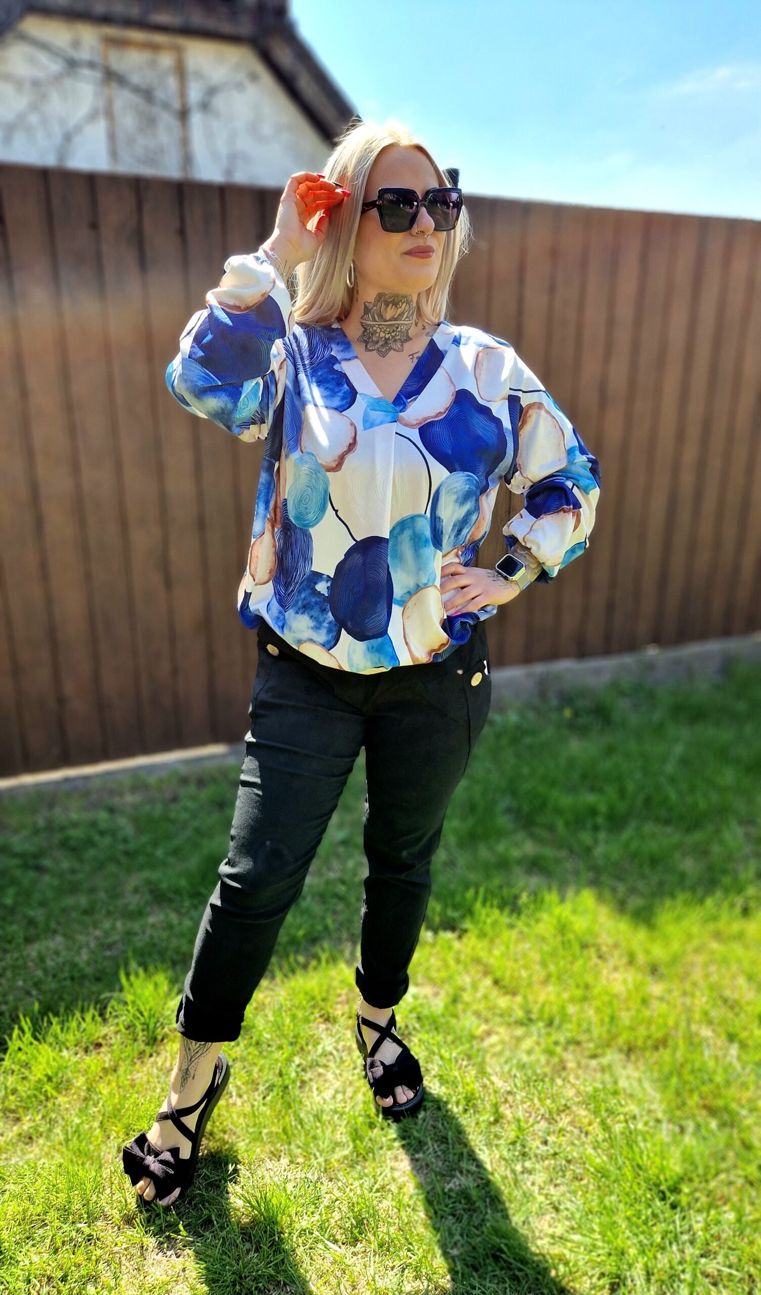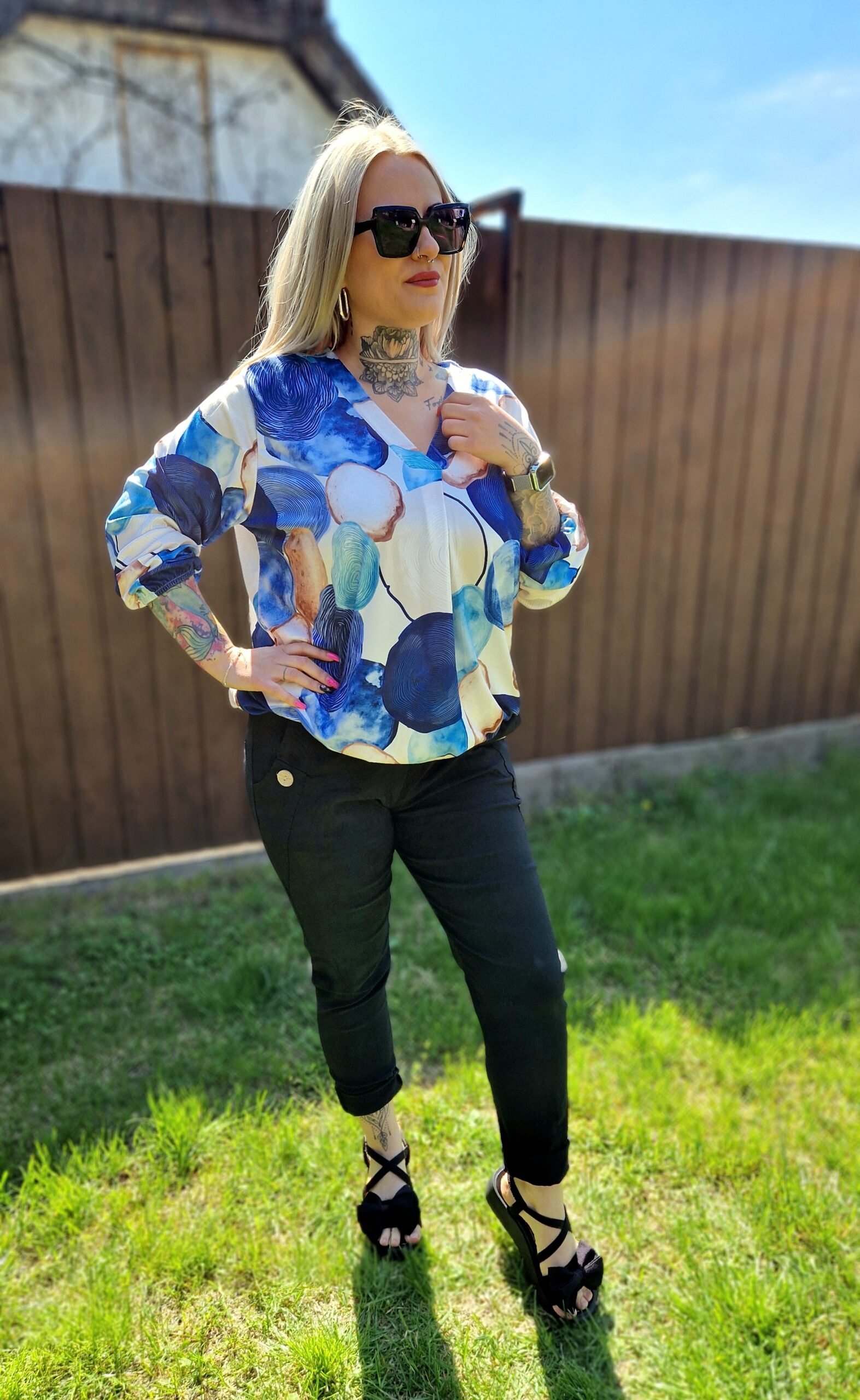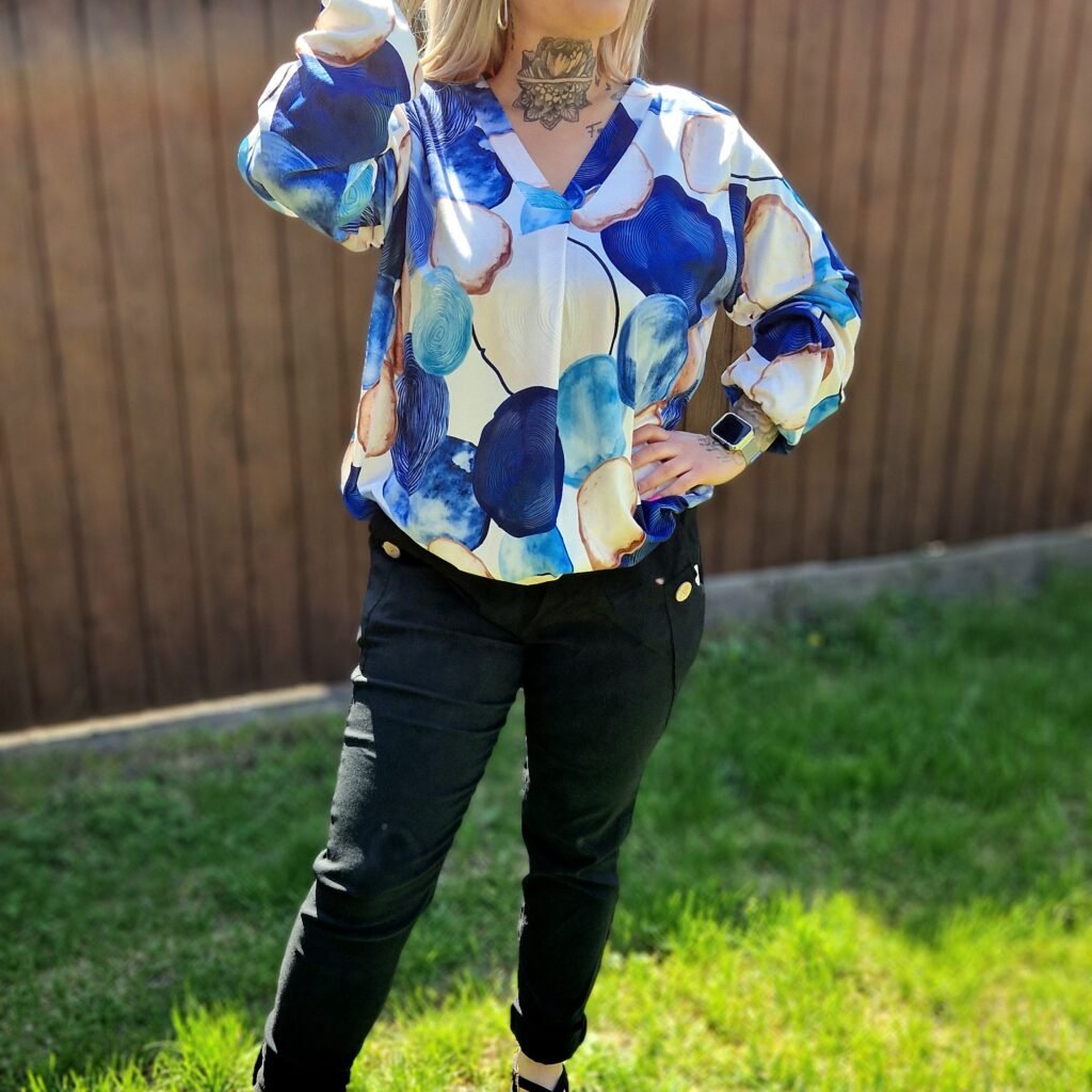A Vanda felső egy igazán nőies, friss darab kék mintával, ami könnyed és elegáns megjelenést ad. A V-nyak szépen kiemeli a dekoltázst, a gumis derékrész pedig kényelmesen illeszkedik és finoman hangsúlyozza az alakot.